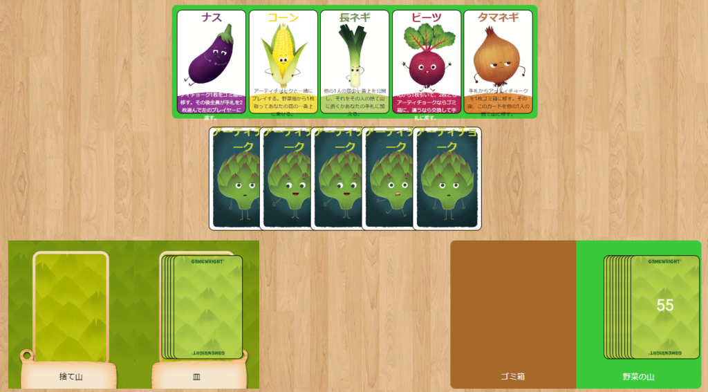 アーティチョークと一緒にプレイしなければならない。野菜畑の中から1枚取り、自分の皿の一番上にのせる。