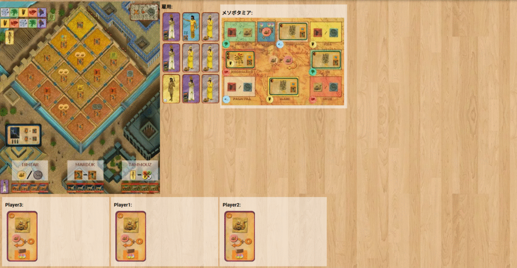 『Amyitis(アミティス)』は、古代バビロンに空中庭園を築くため、資源獲得・交易・灌漑整備・宮廷での影響力争いなど多様な要素を組み合わせて名声点を競う発展系ボードゲームです。