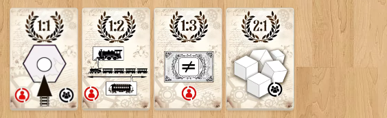 | ❸ | プレイヤー準備 各プレイヤーは以下のアイテムを受け取ります。 ・プレイヤーボード:1枚 ・鉛筆:1本 ・1レベル列車:1枚(右側の最上段に配置) さらに、自分の色を選択して対応する以下も受け取ります。 ・会社トークン:1個 ・同色の株式:4枚 |