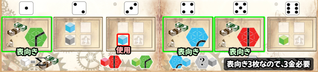| ・ | 表向きの線路タイルで建設する場合 表向きの線路タイル1枚につき 1金 + 残っているキューブ1個につき 1金 |