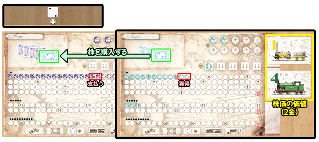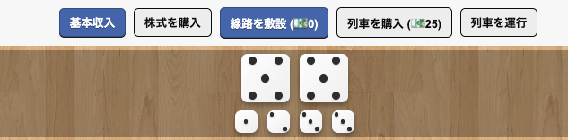 ダイスの出目で、どの会社の株式を購入するか決まり、ダイスの個数で株式が何枚購入するか決まります。
