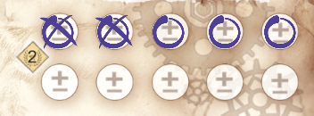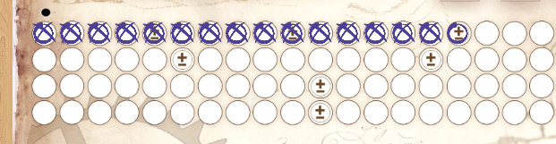 ![]() | 1の段:ダイス修正アイコン 自分のボードにある対応するマスに〇を付けて、ダイス修正の能力を1つ解放します。 |