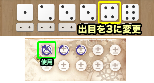 | 次の手番以降、能力を使用してダイスの出目を変更できます。 | |