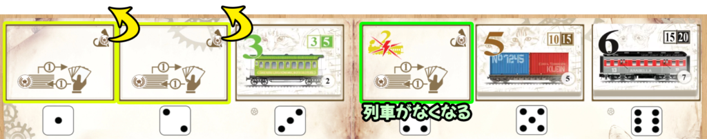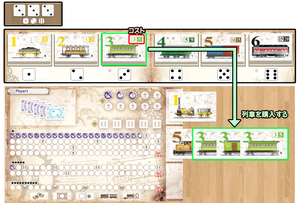 ダイスの出目に対応する列車を、ダイスの個数分だけ購入し、自分のプレイヤーボード右側の列車ラインに追加します。