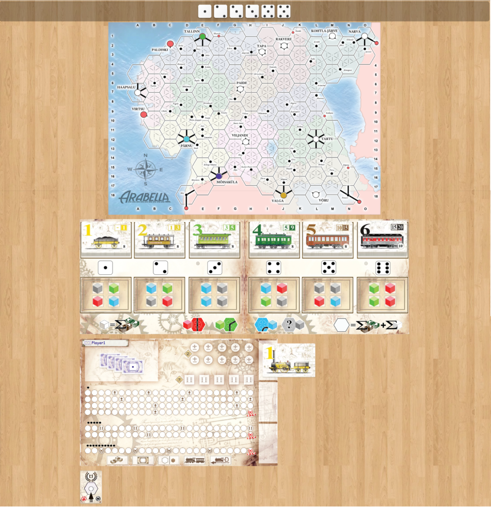 | 特徴 | アラベラは、18XX年をテーマにした1~4人用のロール&ライトゲームで、舞台はエストニアです。目標は勝利点を最も多く獲得することですが、他の18XX年を舞台にしたゲームと同様に、列車、株式、配当金が重要な役割を果たします。 自分のターンになると、プレイヤーは共通のダイスプールからダイスを選びます。選ぶダイスの数と目も重要です。選んだダイスを使って1つのアクションを実行します。アクションとしては、株や列車を購入したり、線路を建設したり、列車を運行して収入や配当を得たりすることができます。ゲームは、いずれかのプレイヤーが収入トラックの終点に到達するか、最後の6編成の列車が購入された時点で終了します。その後、勝利ポイントが獲得されます。勝利ポイントの大部分は達成した目標カードから得られますが、株やアンロックされたダイス/修正値からも得られます。 |