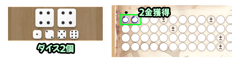 (例:ダイス1個 → 収入1、ダイス3個 → 収入3)
