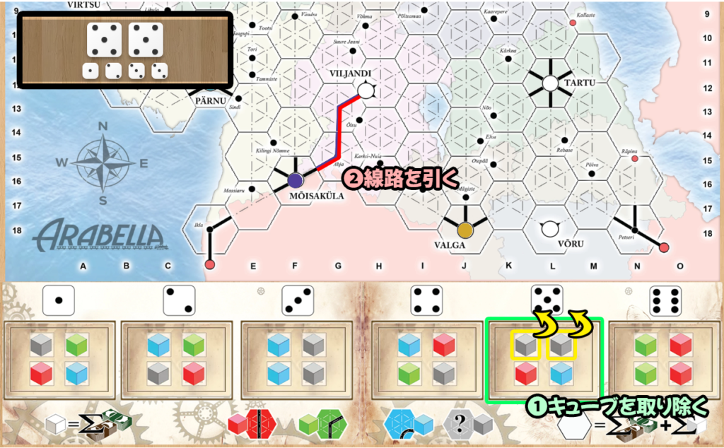 ダイスの出目と個数に応じて、線路を建設します。