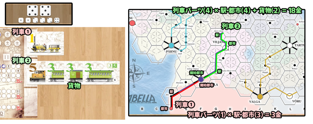 列車に貨物車両がある場合、通過した都市ごとに、貨物1両につき追加で1金を獲得します。