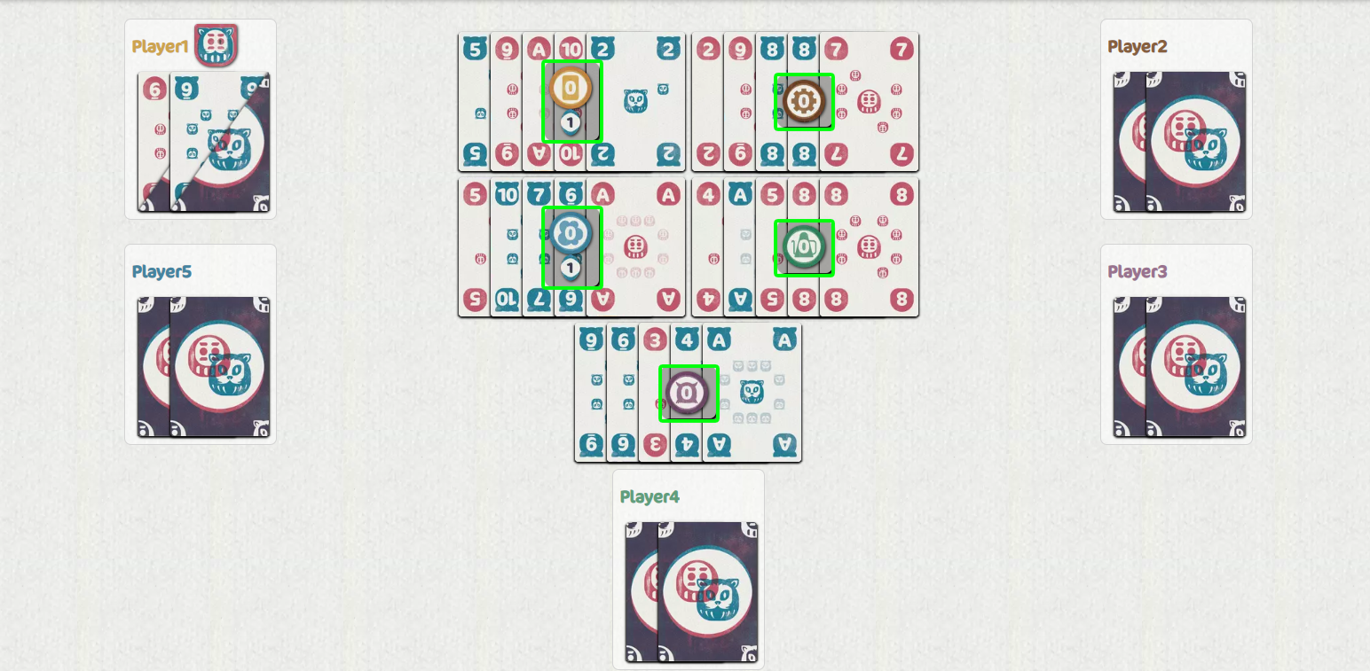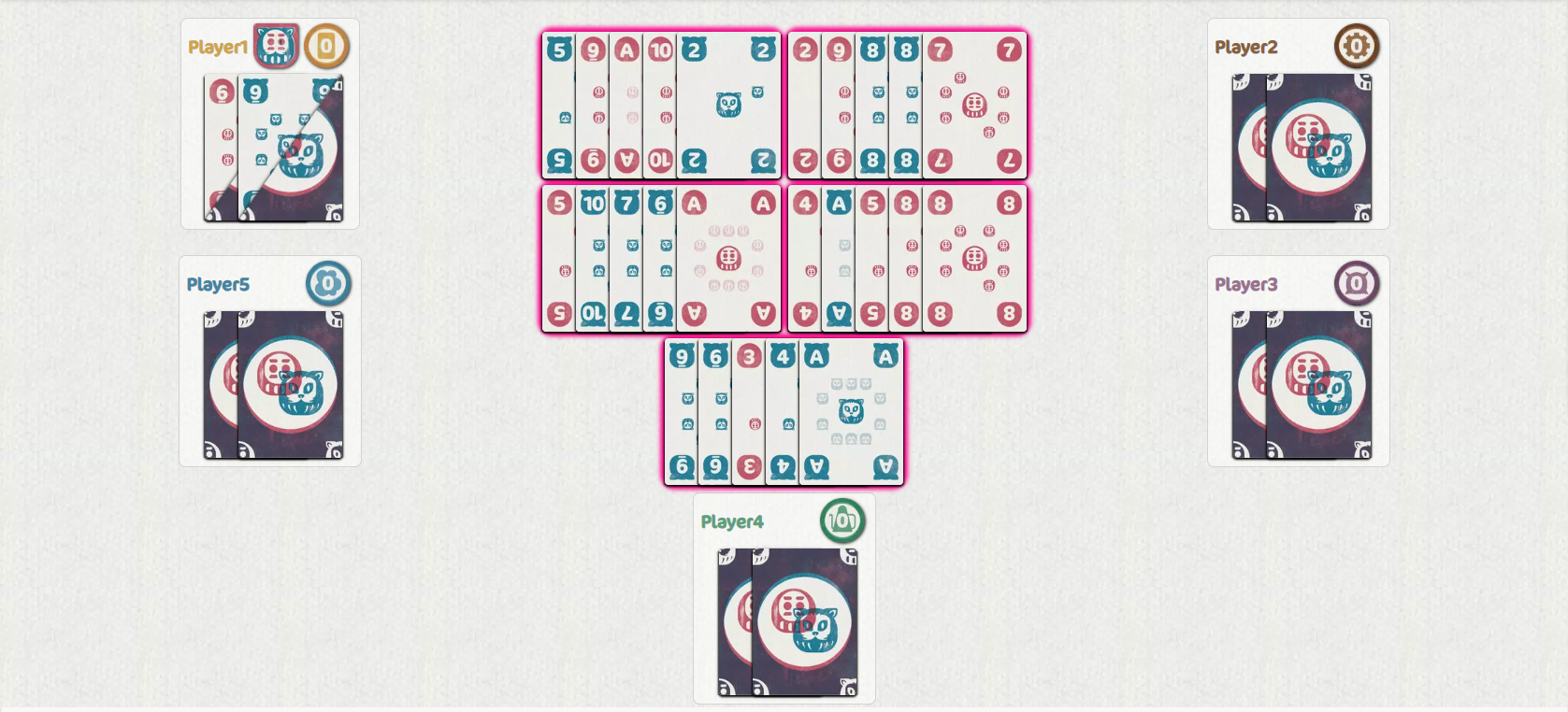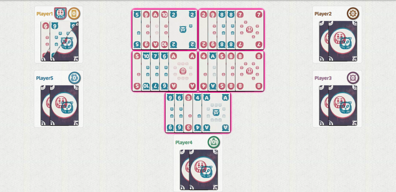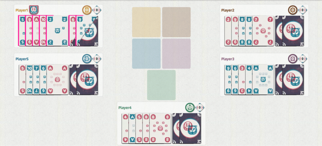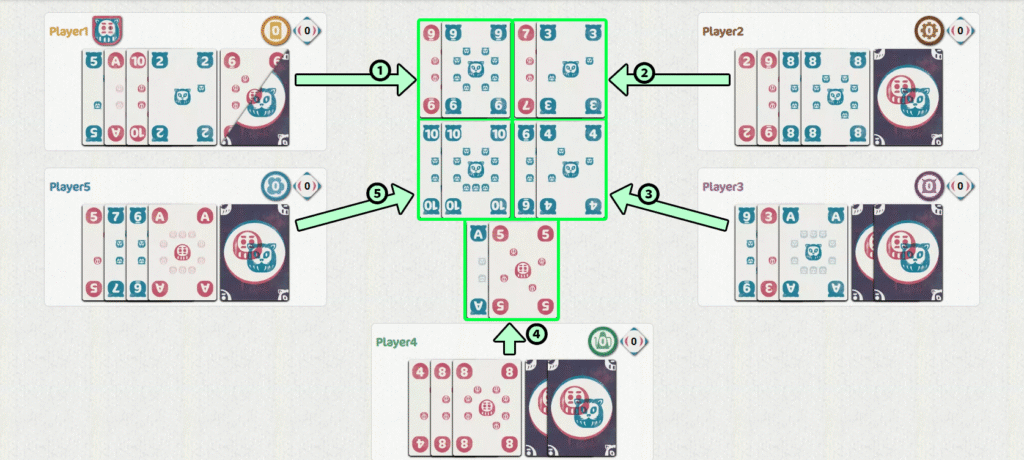 各セットは6枚ずつで、5人プレイの場合のみ5枚ずつ配置します。