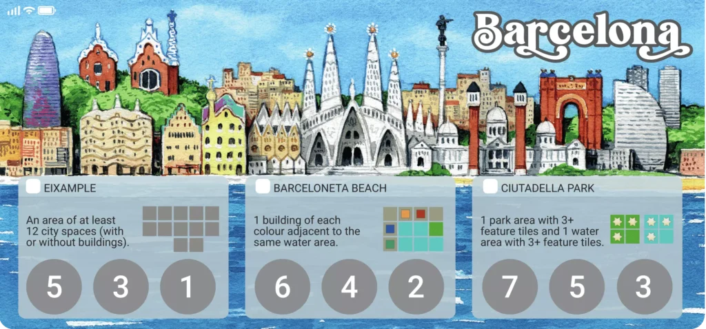 シウタデリャ公園特徴タイルが3つ以上ある公園エリア1つと、特徴タイルが3以上ある水エリア1つ7点/5点/3点