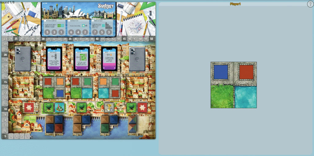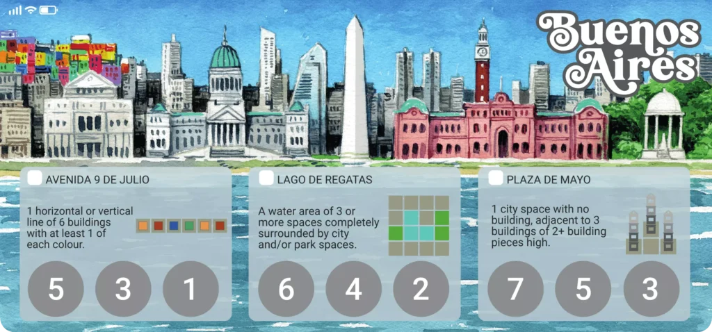 プレイヤーは労働者コマを使って都市タイルや建物、特徴タイルを獲得し、自分の都市を発展させていきます。建物の高さや色の組み合わせ、都市実績の達成、水や公園エリアの構成など、さまざまな得点要素が用意されており、どの要素を優先するかが戦略の鍵となります。