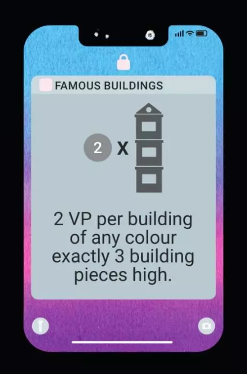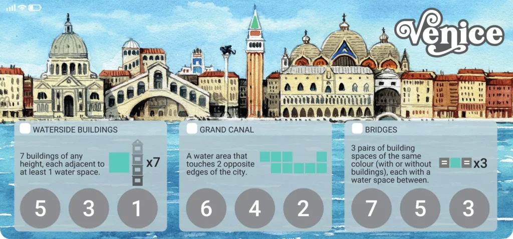 1つの水スペースを挟んで上下か左右にそれぞれ同じ色の建物スペースのペア3つ(建物の有無にかかわらず)。7点/5点/3点