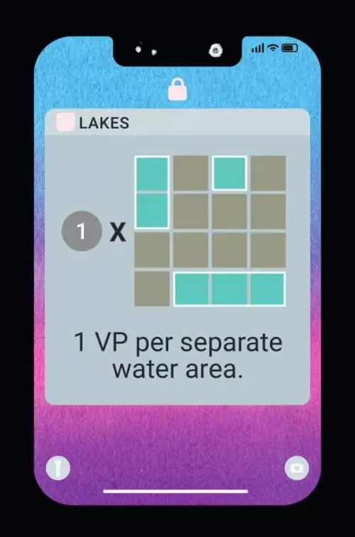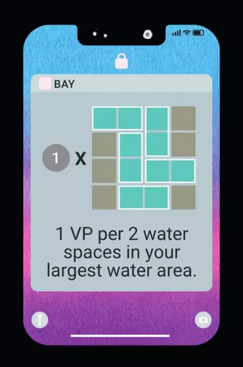 隣接する水スペース内に1/2/3/4種類の特徴タイルに対して1/3/6/10点を獲得できます。