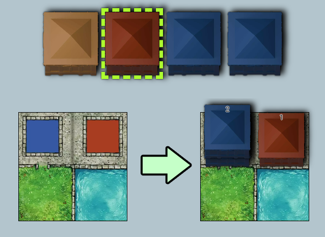 建物コマを3~4個を受け取り、自分の地区にある同じ色の建物スペースもしくは建物コマの上(4個まで重ねて配置可)に配置します。