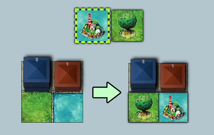 特徴タイル(1~2枚)を受け取り、各特徴タイルを対応するマスに自分の地区に置きます。特徴タイルを置けない、または置きたくない場合は捨てます。
