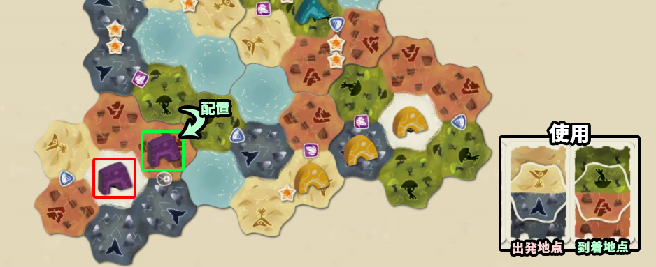 | ・ | 他プレイヤーのキャンプを通過する場合 他プレイヤーのキャンプがあるマスを通過する場合、そのマスに対応する地形カード1枚を捨てずに、そのプレイヤーに渡します。 |