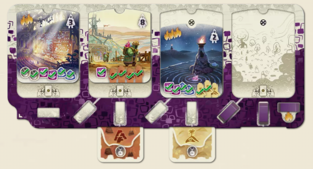 | 【炎アイコンのカウント対象】 ・達成したストーリータイルの炎アイコン(左上) ・部族ボード下に差し込んだ地形カードの炎アイコン ・最後のキャンプを配置したことで得た炎アイコン | |