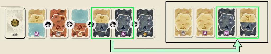 表向きに並んでいる地形カード列から、隣り合う2枚を選んで手札に加えます。