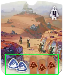 | 3/5/7個目 | 地形カードを差し込む 手札の地形カード1枚を選び、部族ボード下の対応するスロットに差し込みます。差し込んだカードの地形タイプと資源アイコン(あれば)を得ることが出来ます。 |