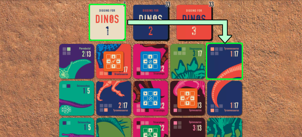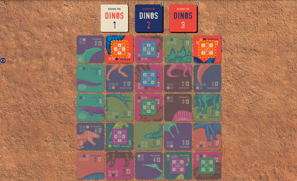 プレイヤーは2体の古生物学者トークンを使い、毎手番1体を発掘現場上を移動させながら化石タイルを収集します。化石には恐竜の種類と位置が描かれており、同じ恐竜のパーツをすべて集めると「完成」となり、ボーナスを獲得することができます。