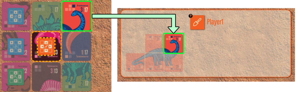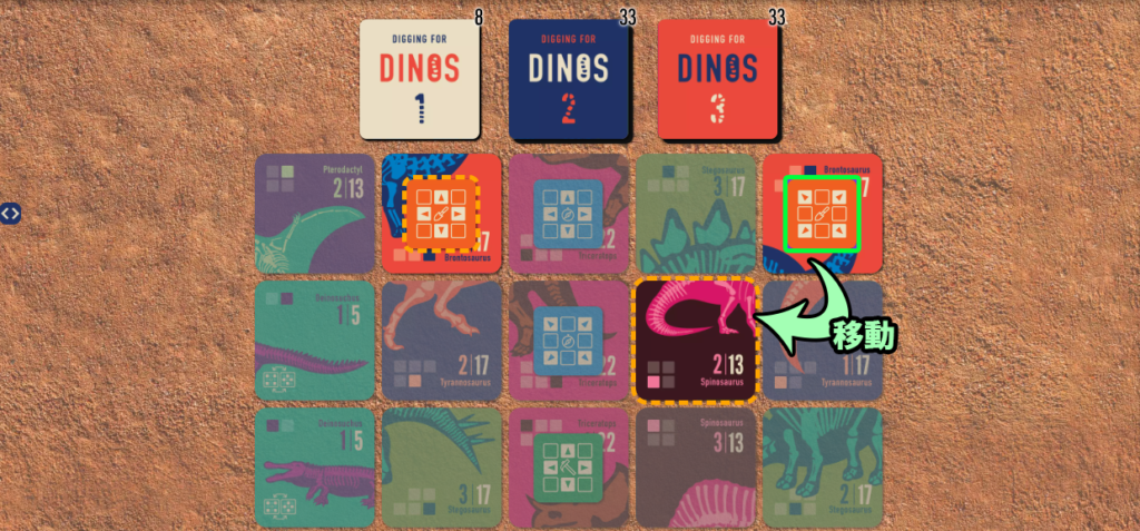 自分の2体の古生物学者のうち1体を選び、上面に描かれた方向へ1マス移動させます。
