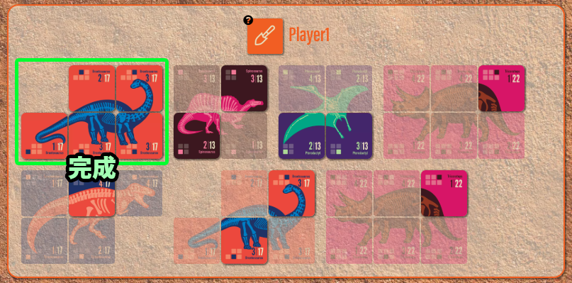 | 完成した恐竜セット | そのセットの右の数字(完成ボーナス)を1回だけ加算する。 (タイル個別の得点は加算しない) |