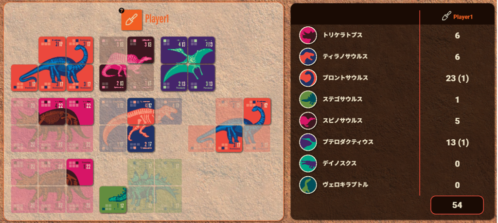 プレイヤーは集めた化石タイルを自分の前に見やすく並べておきます。