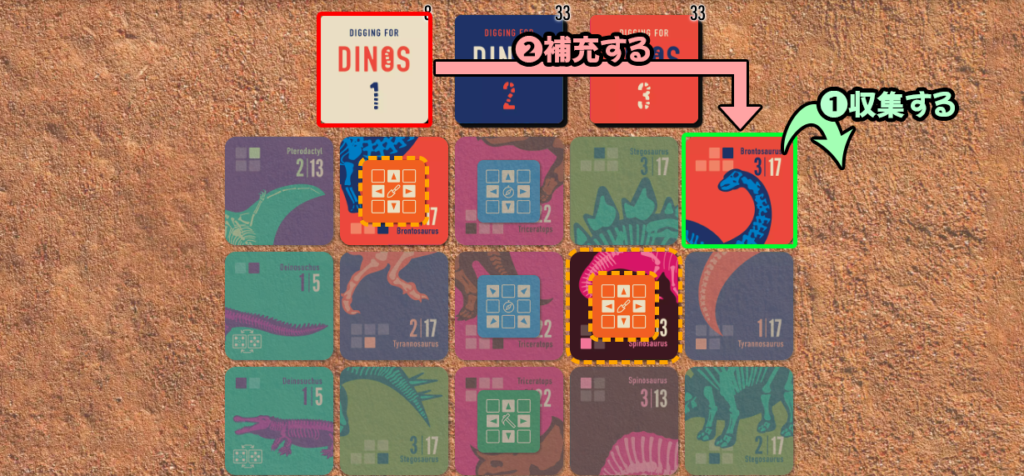 移動後、以下の流れで化石を収集し、新しいタイルを補充します。