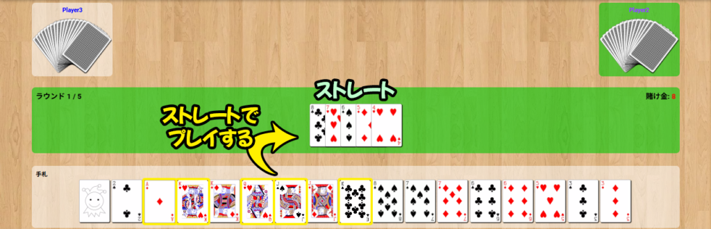 場にカードが出されている場合は、場のカードと同じ役・同じ枚数で、より強い組み合わせでカードをプレイすることが出来ます。(※ボム・ロケットは例外)