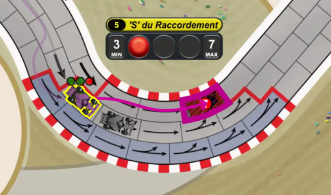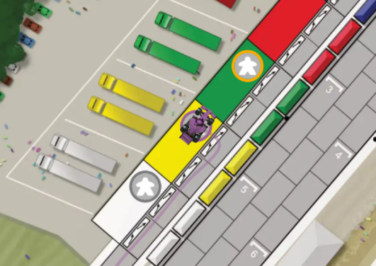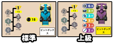 | 17~20 | 素晴らしいスタート! 即座に4マス前進します。このとき、他の車を避けるために1~2レーン変更することができます。車はまだ1速の状態ですが、次のラウンドで2速にシフトアップすることができます。 |