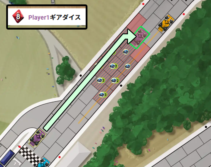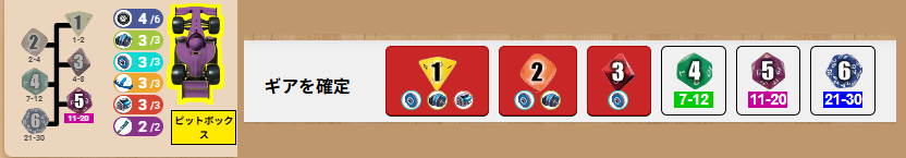 選んだギアに対応するダイスを振り、出目のマス数だけ車を前方に移動させます。