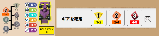 | 1 | 悪いスタート エンジンが停止してしまい、このラウンドでは1速に入れることができません。 次のラウンドまで待機し、その後は黒ダイスを振ることなく、1速でスタートします。 |