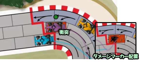 その車が移動を終えたマスにダメージマーカーを配置します。