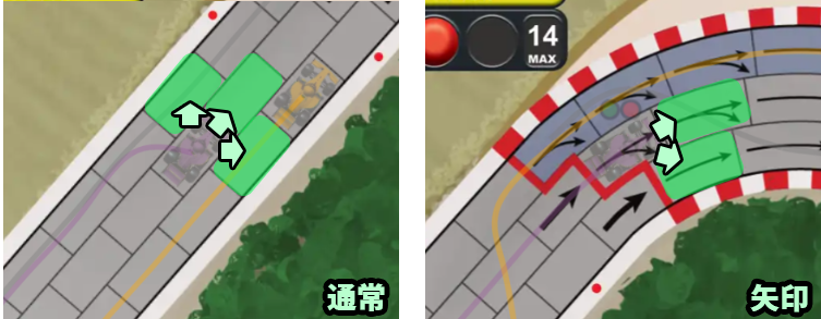 通常のマスでは、車は前方もしくは斜め前に進むことができます。