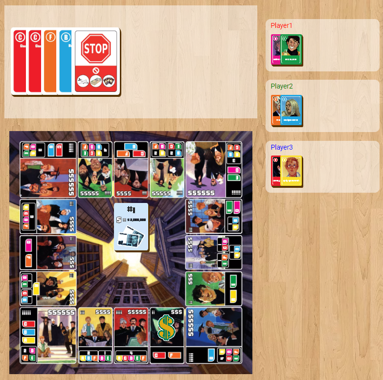 横長の色枠に書かれた英字は、商談成立のために必ず要る投資家 (またはその親族。 影響カードの中にある 「親族カード」を使えば、投資家の代わりになります) の姓の頭文字を意味します。