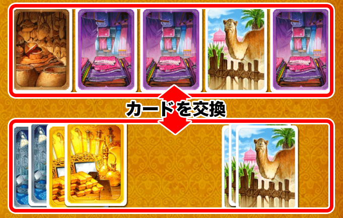 手札の『商品カード』もしくは『ラクダカード』(混合も可)を複数枚場に出し、場にある『商品カード』と交換できます。