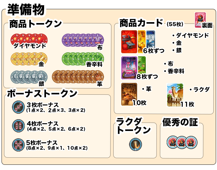 『商品トークン』『ボーナストークン』『ラクダトークン』『商品カード』を下記のように準備していきます。