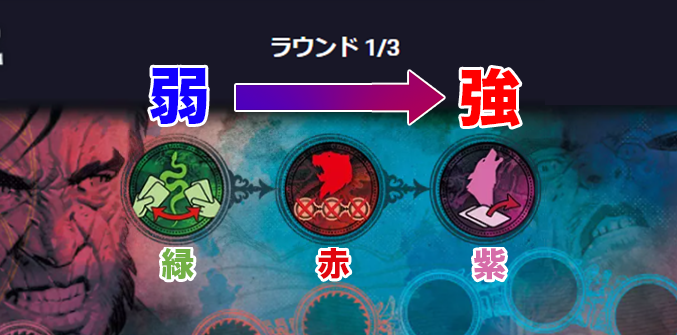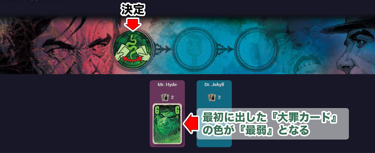 2色目の『大罪カード』が出された時に、その色は中間の色になり、残りの色が一番強い色となります。