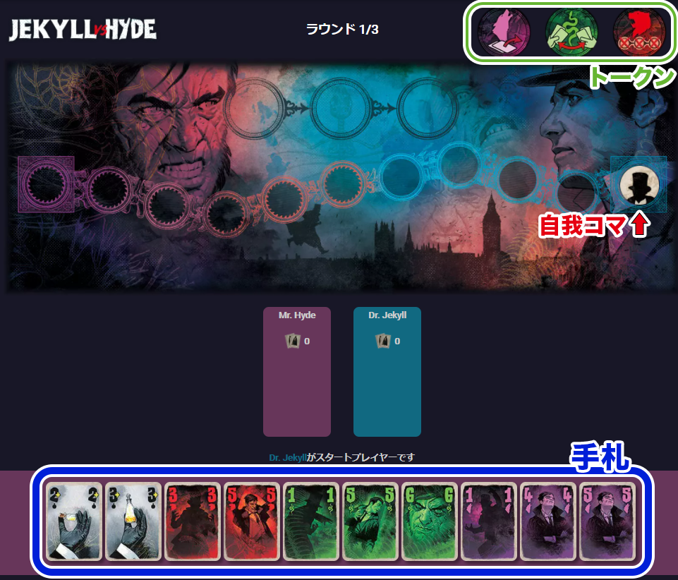 『自我コマ』を進めたマスが4マス未満の場合は『ジキル』がスタートプレイヤー、5マス以上進めた場合は『ハイド』がスタートプレイヤーです。