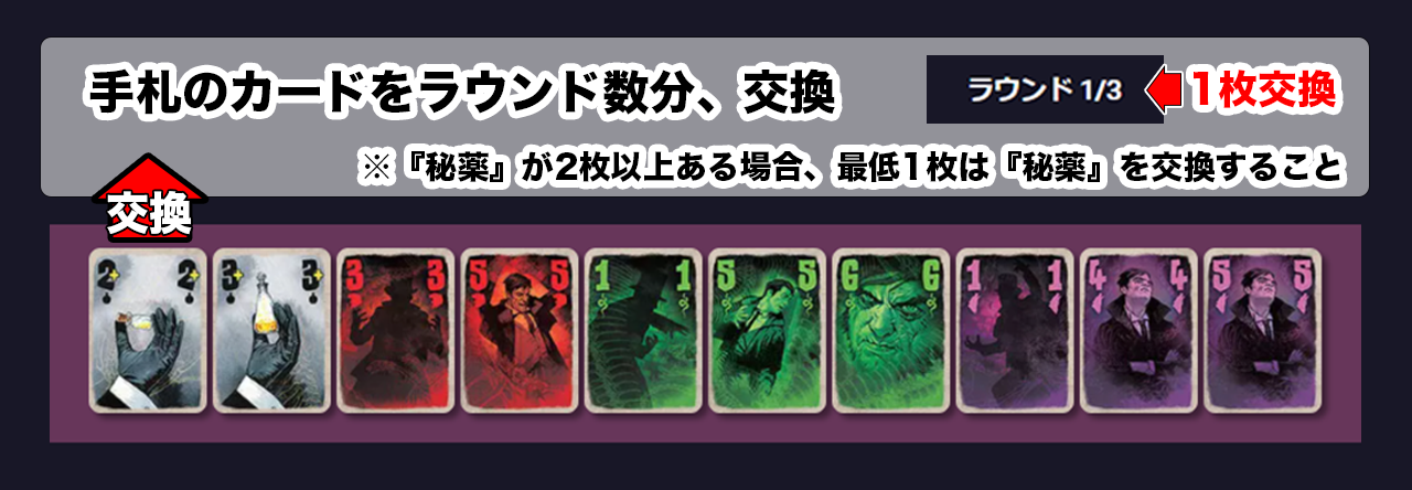 交換するカードは自身で選べますが、『秘薬カード』を2枚以上持っている場合、必ず1枚は『秘薬カード』を交換カードに含めるようにして下さい。