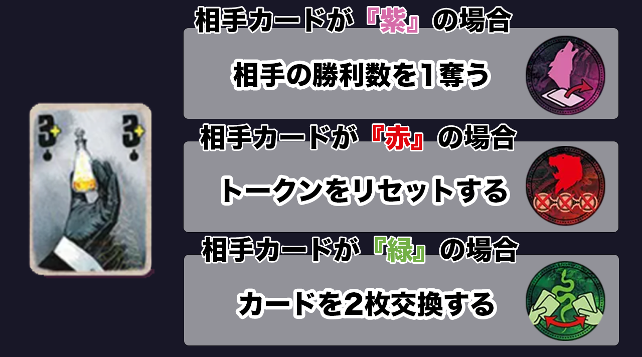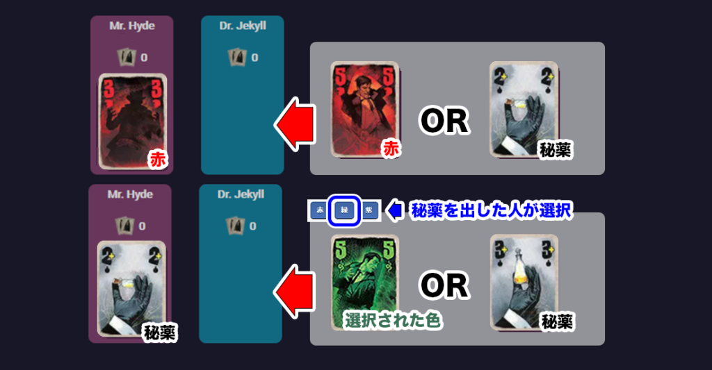 『秘薬カード』を使用した時、相手の出したカードの色によって、効果を発動します。(後攻で『秘薬カード』を出した時も発動します。)