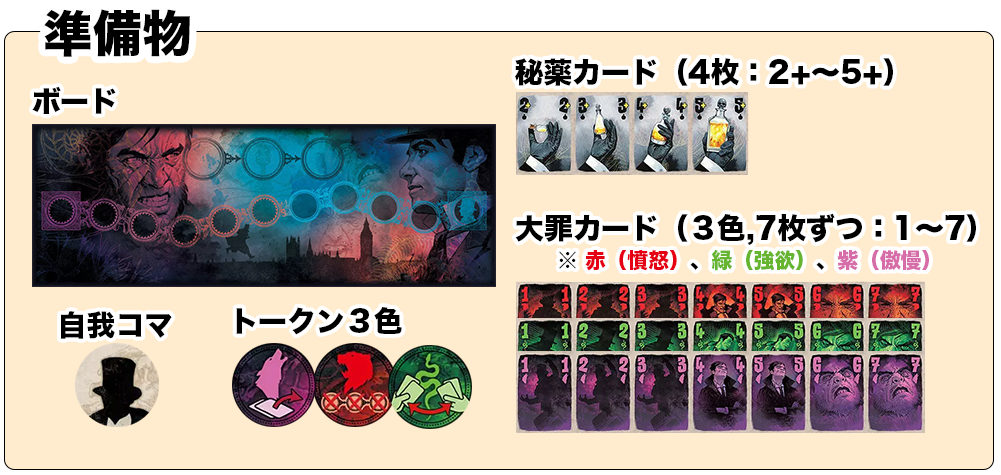 このボードゲームはRobert Louis Stevenson氏による有名な小説『ジーキル博士とハイド氏』をテーマにしているボードゲームです。