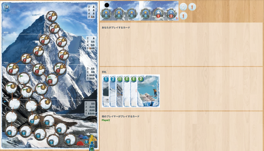 ただ登るだけでなく、天候の悪化や高所での体力低下、リスクトークンなど厳しい状況をどう乗り切るかが重要です。攻めれば高得点を狙える一方、無理をすると登山家が倒れて得点が失われてしまうため、登るタイミングと撤退の判断が勝敗を大きく左右します。