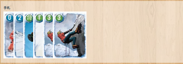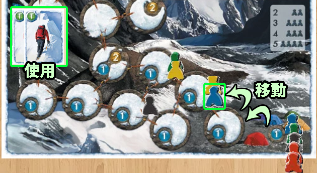 | ・ | 移動 | 【緑のカード】登山家を数字の数だけ移動させる |
