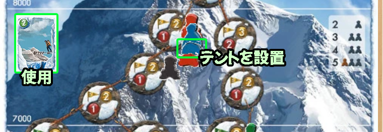 緑のカードを使って、登山家がいるマスにテントを設置できます。