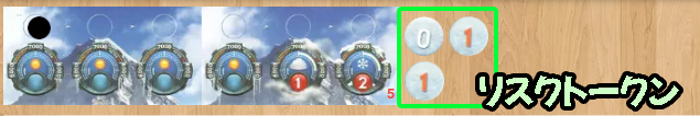 場に出した3枚のカードに記された移動ポイント(左上の数字)の合計が最も高いプレイヤーは、リスクトークンを1枚選んで受け取ります。