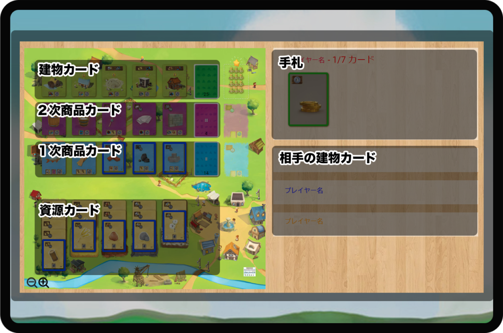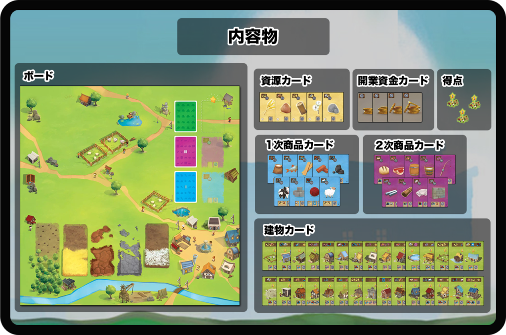 『資源カード』『1次商品カード』『2次商品カード』『建物カード』の4種類があります。