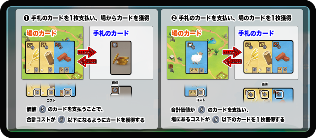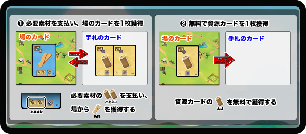 ❶ 必要素材を支払い、場のカードを1枚獲得する。