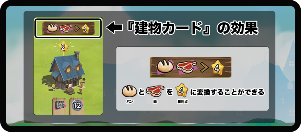 『建物カード』を建設することで、建物の星マークに書かれている数字分の勝利点が獲得できます。