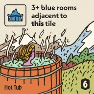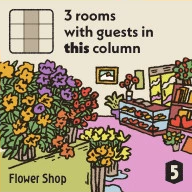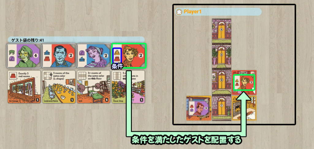 部屋や設備を建設し、条件を満たす形でゲストを配置していきます。ゲストの人数や配置階によるボーナス、設備タイルの達成得点などを積み重ね、効率よく得点を伸ばしていきます。